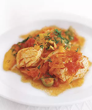 Moist, flaky halibut (or any white fish), swimming in a tangy sauce.